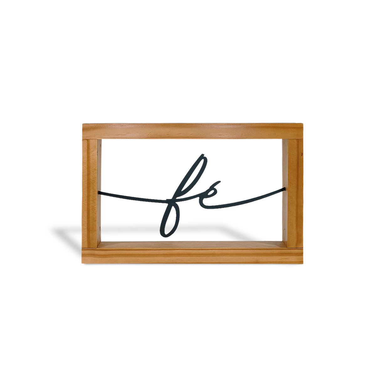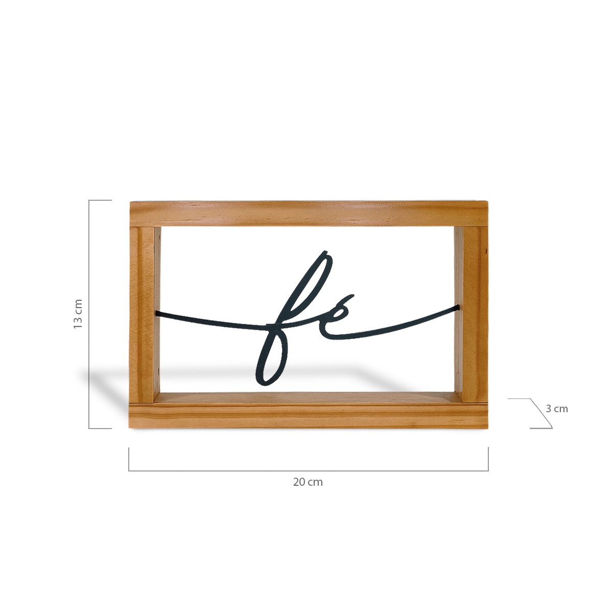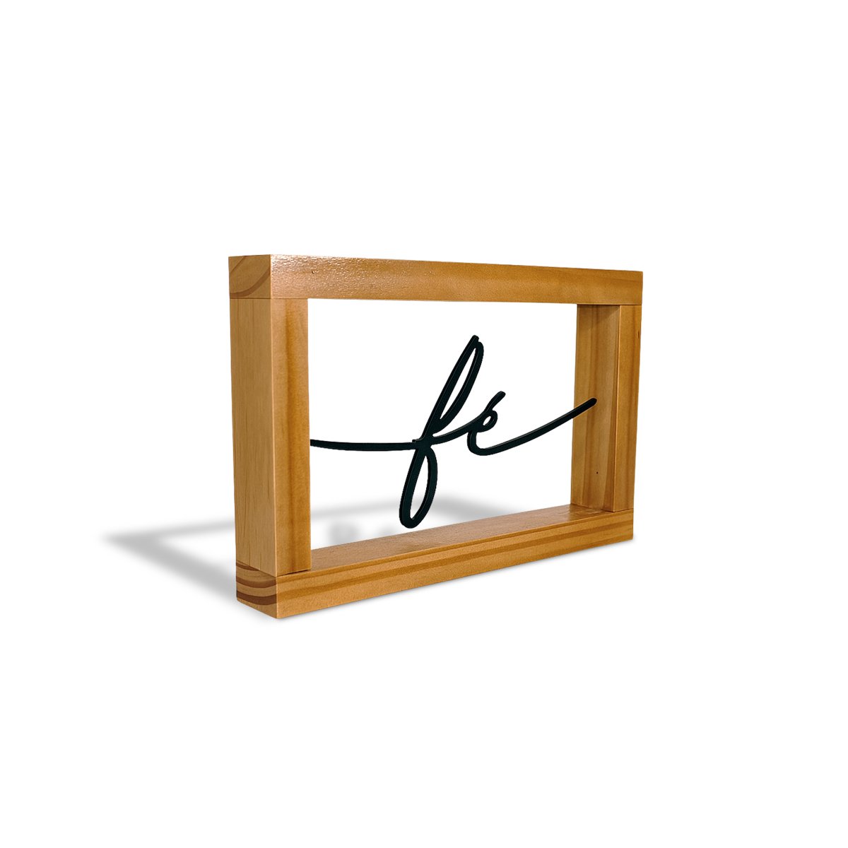 Espalhe afeto na decoração com a Escultura Moldura Fé – Ref. 10523006. Fabricada no Brasil em chapa de aço preta com base de madeira pinus tom nogueira, a peça leva a palavra “FÉ” recortada a laser para prateleiras, aparadores ou mesas de cabeceira.