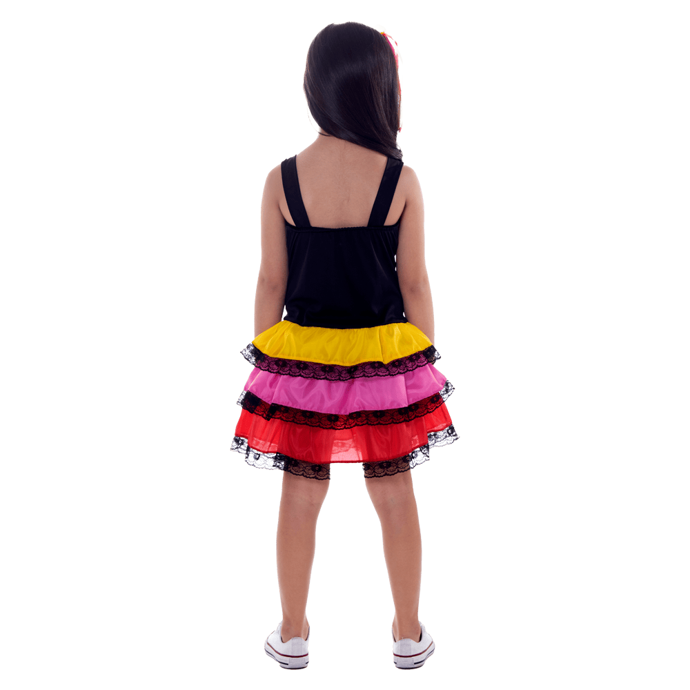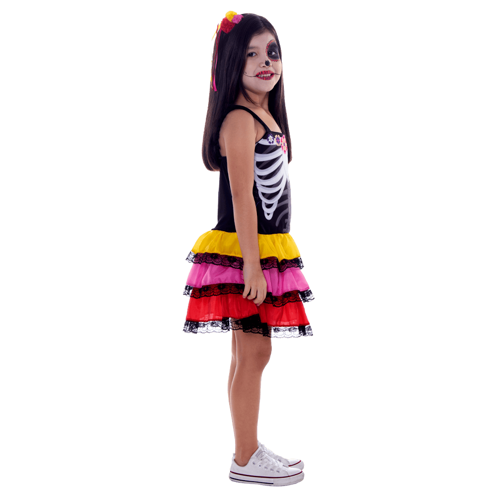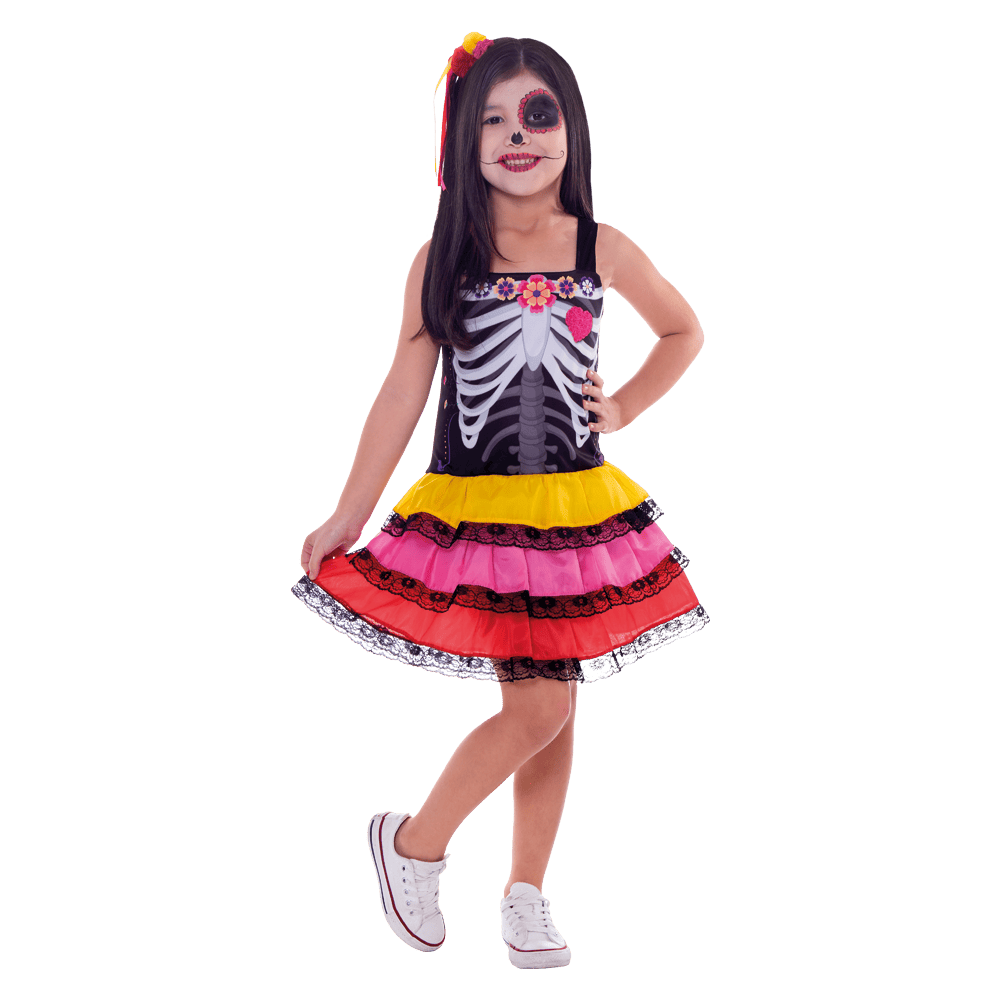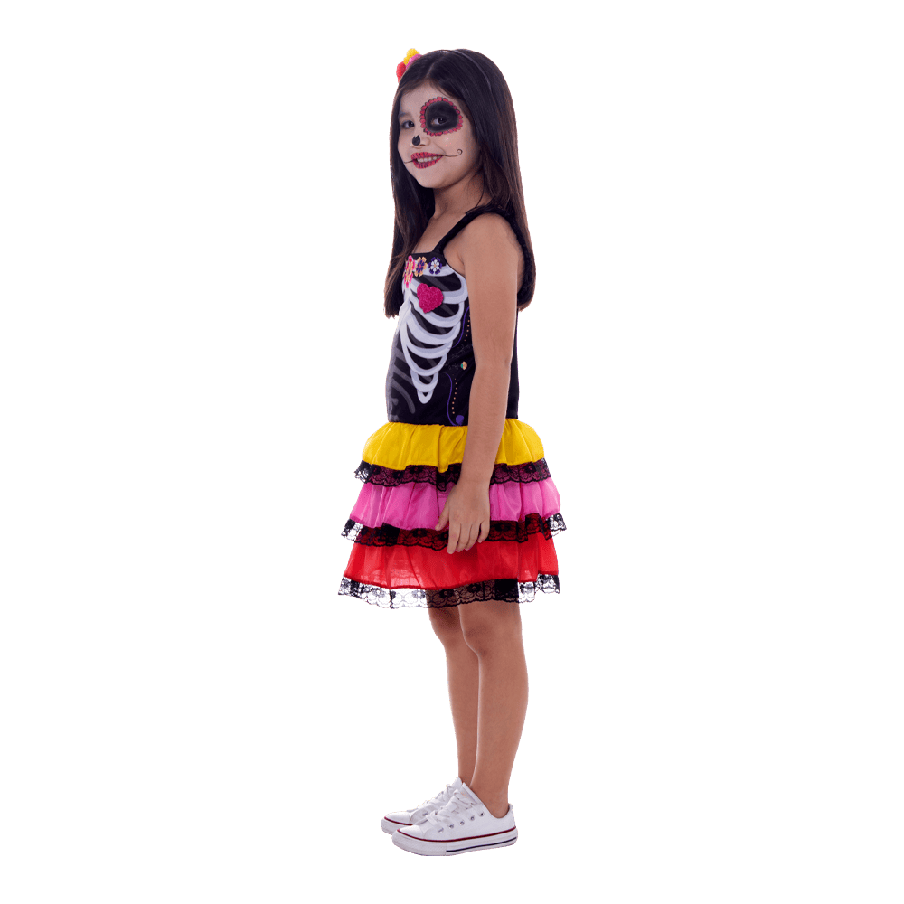Fantasia Caveira Mexicana Infantil Feminina Halloween – Com Acessório Tiara com Flores
