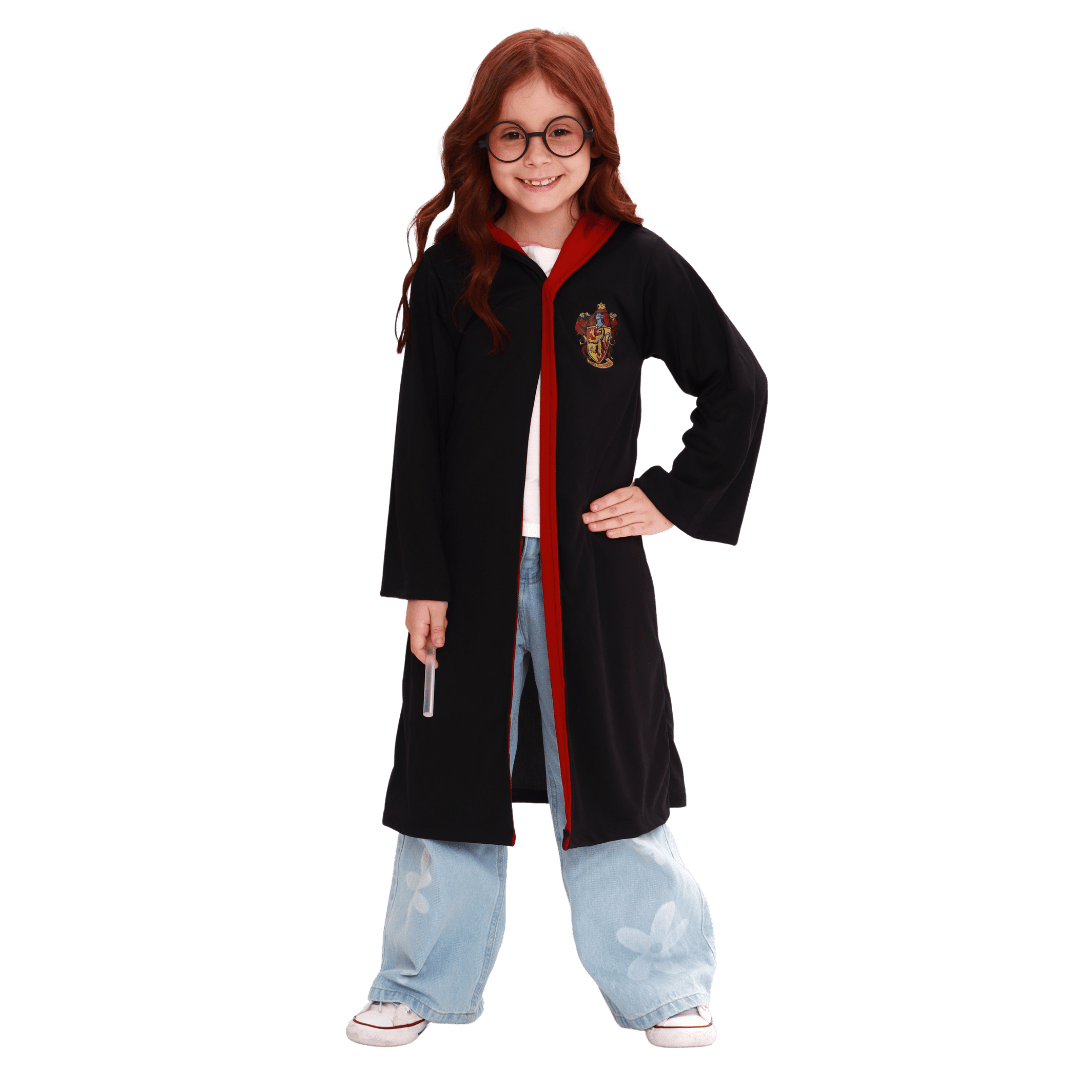 Transforme qualquer brincadeira em aventura com a Fantasia Harry Potter – Capa com Capuz e Óculos (Não acompanha varinha). Feita com fibra têxtil macia, acabamento reforçado e estampa resistente, entrega conforto e durabilidade para festas, escola, Carnaval, Halloween e o dia a dia da imaginação.