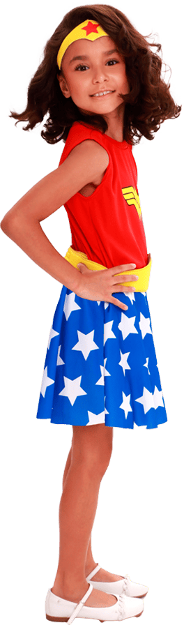Transforme qualquer brincadeira em aventura com a Fantasia Mulher Maravilha – Vestido, Cinto e Tiara. Feita com fibra têxtil macia, acabamento reforçado e estampa resistente, entrega conforto e durabilidade para festas, escola, Carnaval, Halloween e o dia a dia da imaginação.