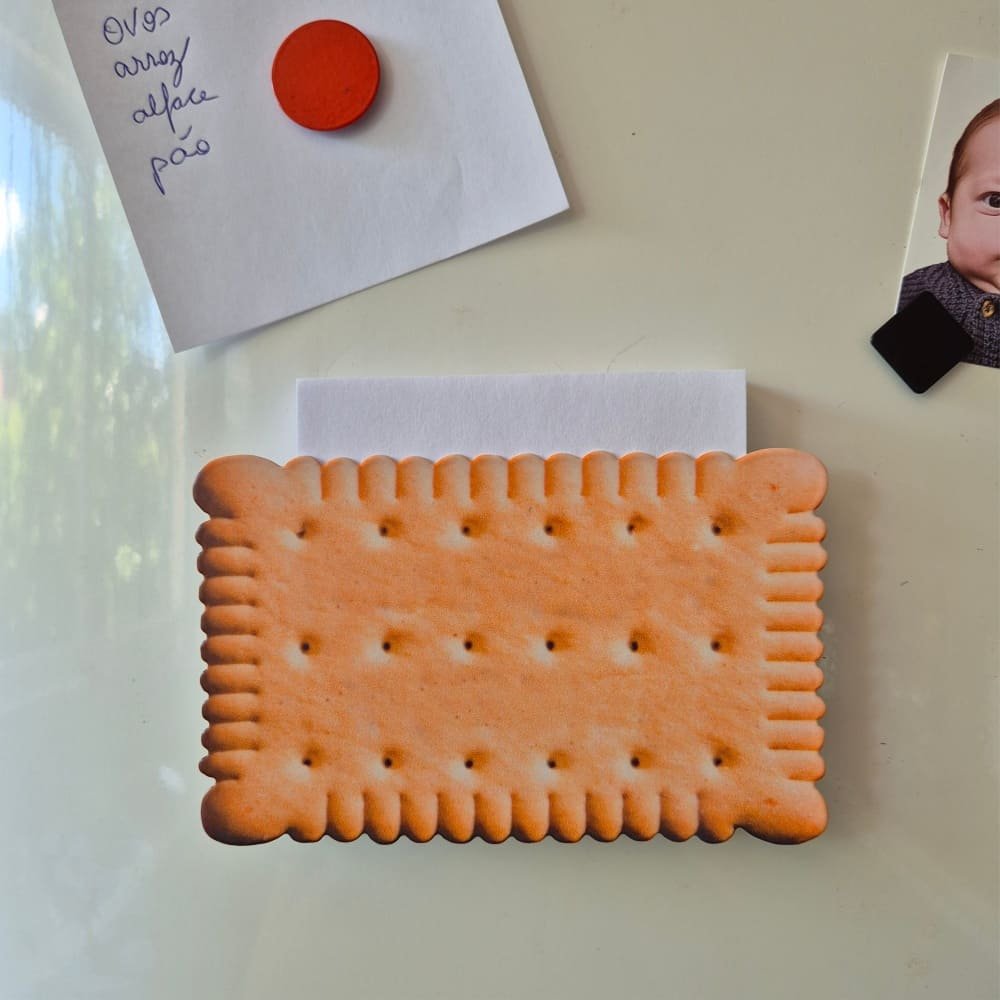 Anote recados e listas de compras com praticidade usando o Ímã Porta Recado de Geladeira Bolacha – Coleção Anote Aí. Com design divertido em formato de bolacha, ele fixa facilmente em superfícies metálicas e acompanha bloco de papel para o dia a dia.
