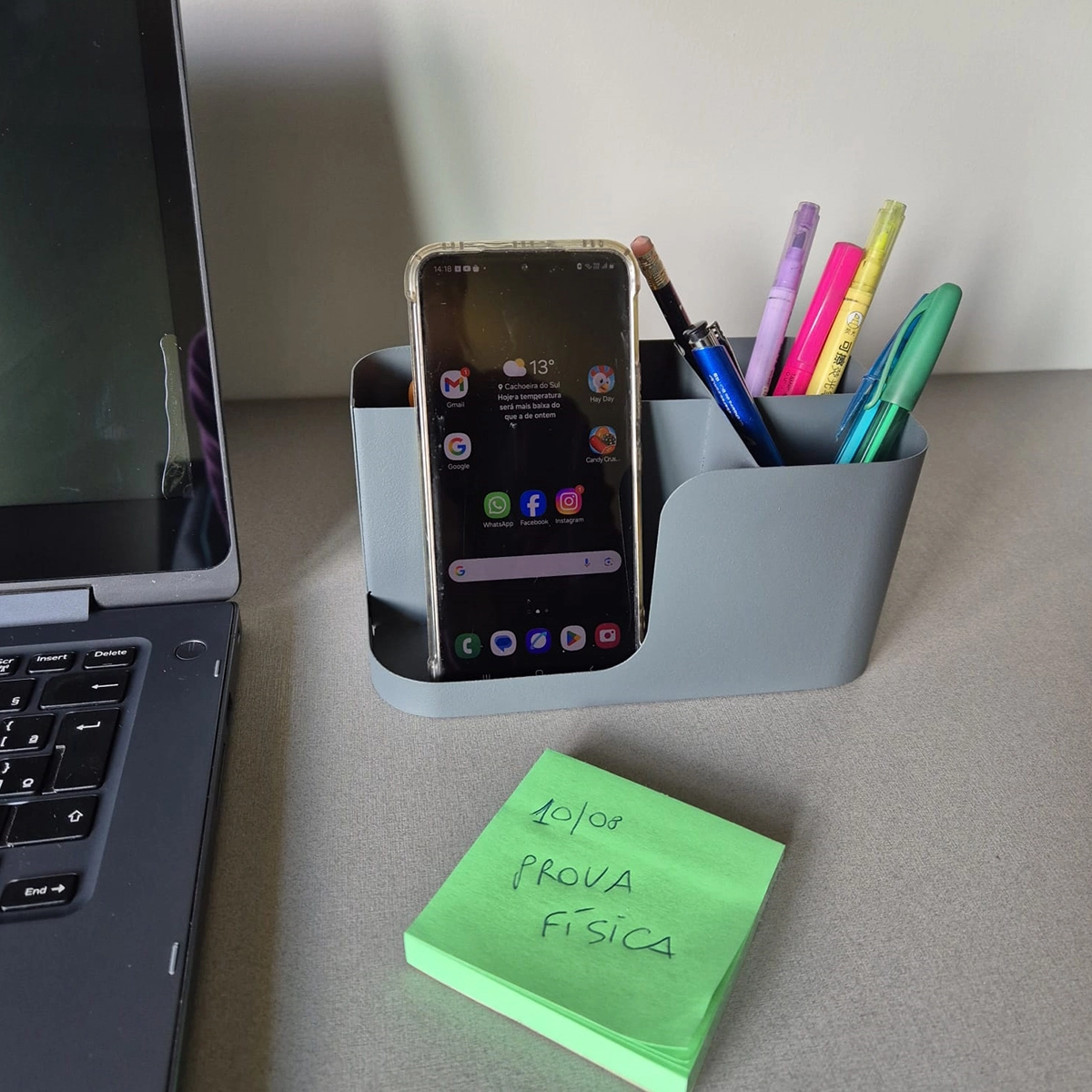 Organize sua mesa com estilo e praticidade usando o Porta Caneta e Celular Kit Básico Grafite – Coleção Básica. Produzido em aço com pintura epóxi e design minimalista, ele acomoda celular, canetas, lápis e tesoura, deixando o ambiente de trabalho mais funcional e elegante. Uma ótima opção para presentear no Dia dos Pais.