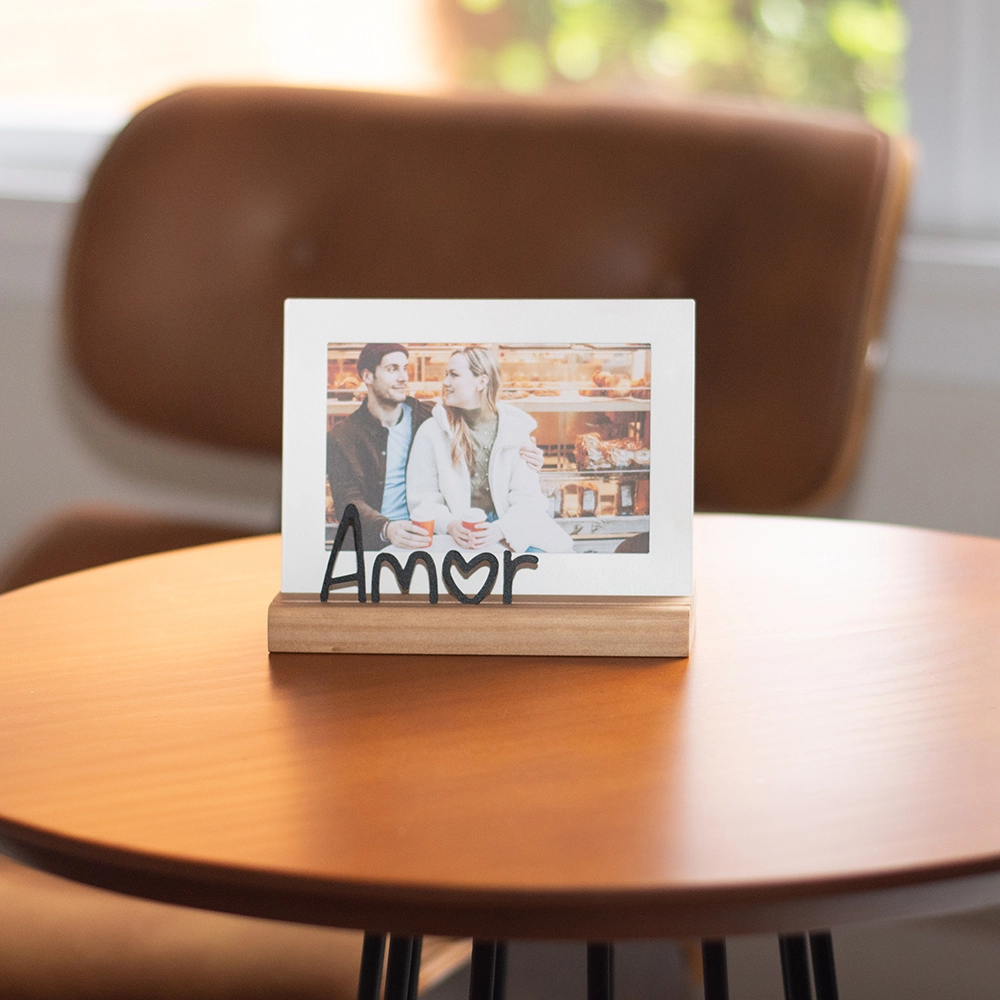 Eternize momentos especiais com o Porta-Retrato 10×15 cm Amor – Coleção Amor. Produzido em aço, acrílico e madeira certificada, ele é ideal para decorar ambientes e presentear, acomodando uma foto na posição horizontal ou vertical com delicadeza e significado.