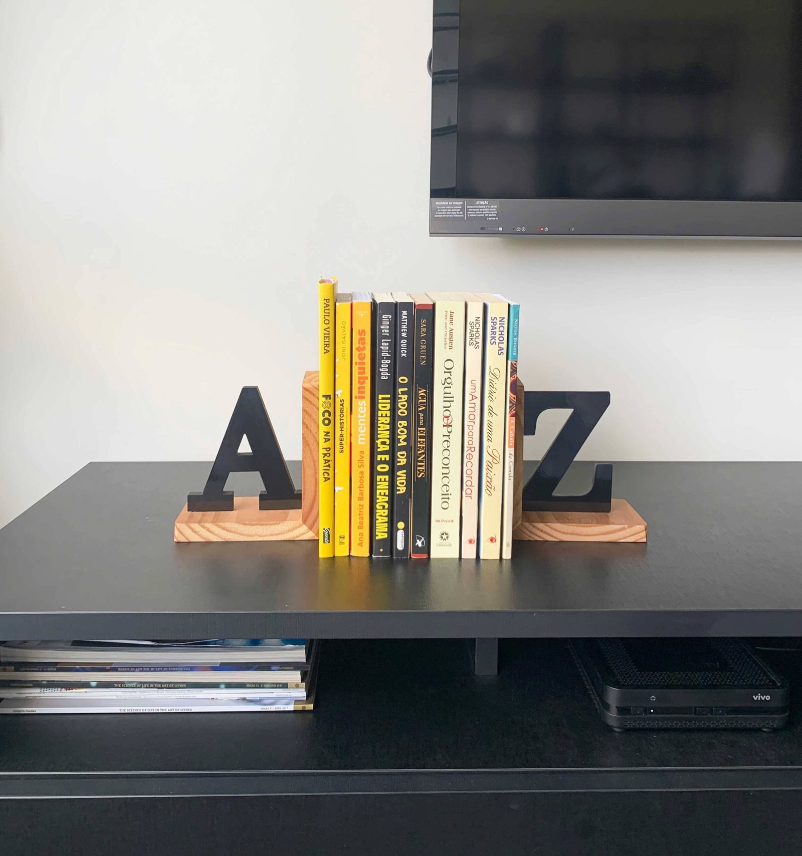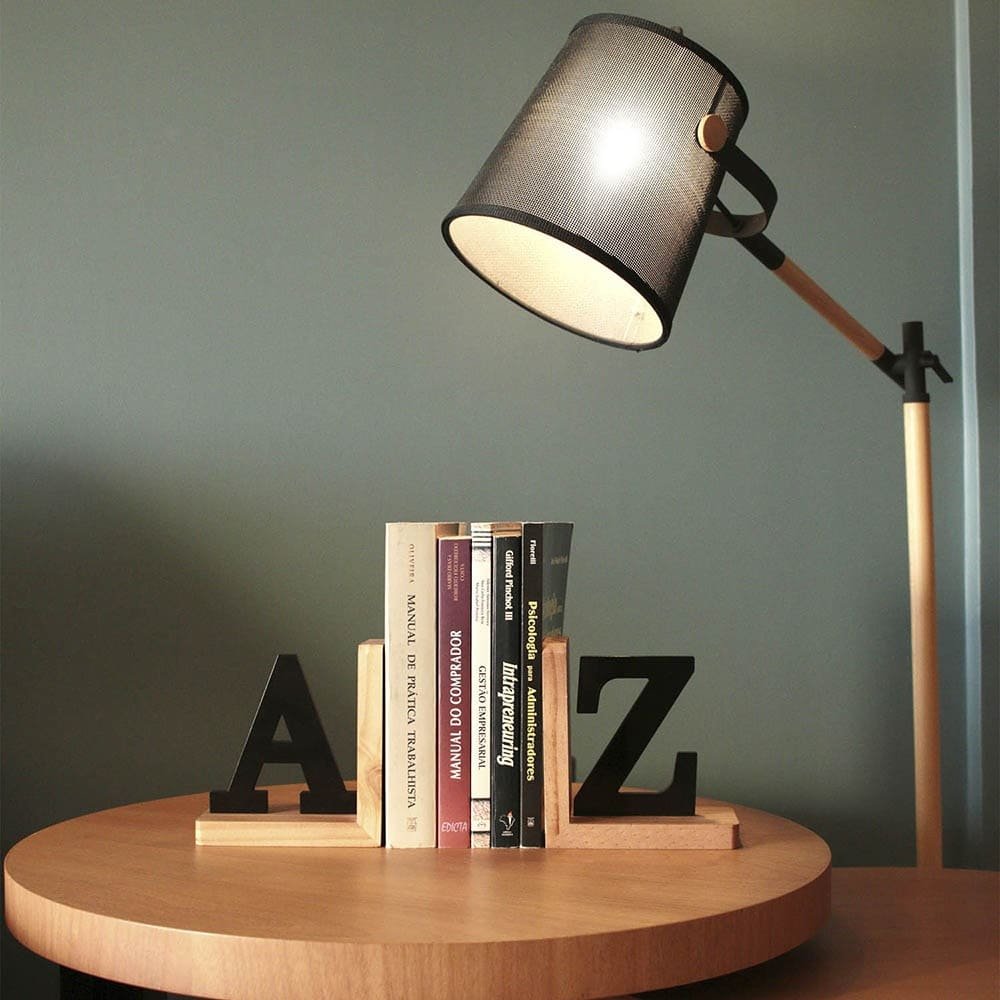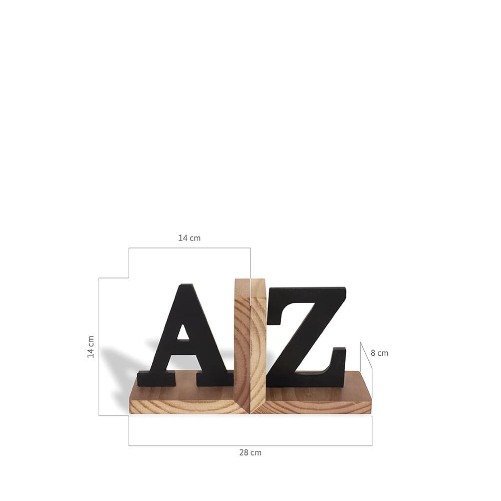 Porta livros decorativo em formato A–Z, em aço, MDF e madeira.